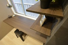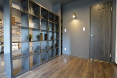 お部屋の中へ。玄関扉をあけた正面はオープンシェルフ。一番最初に目に入るところなので、お気に入りのインテリアや植物などを見せながら収納してみてはいかがでしょう?もちろん靴を置いてもいいかと。棚は可動式なので高さの調節ができます。