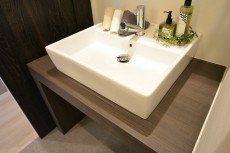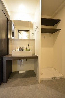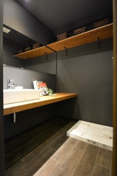 シックな雰囲気の洗面室。木のあたたかみが感じられる広々としたカウンターが印象的です。小物が置いておけるので身支度もスムーズに進められるはず。