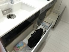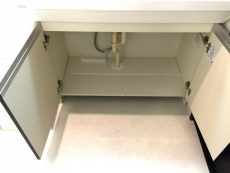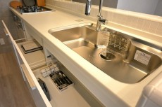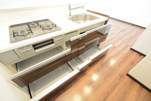 調理台下は全て引き出しタイプの収納になっていました。引き出しタイプは奥の方まで出し入れがし易くて助かります。調理台後ろには冷蔵庫や家電ラック、食器棚などのスペースがありますので、収納場所が足りない時はこちらへどうぞ。