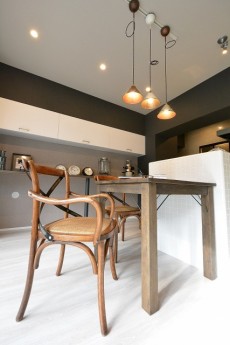 ダイニングテーブルはこんな感じでキッチンの真横に置いてみてはいかがでしょう?(後片付けも楽です。)上から下がったレトロっぽいアイアン照明もいい雰囲気を出しています。写真クリックすると拡大するのでゼヒじっくりご覧ください。