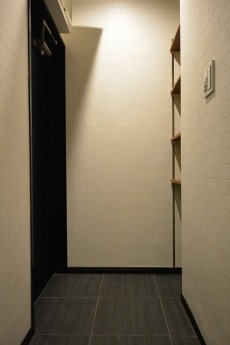 玄関ドアを開けて正面には収納棚、廊下の右にはトールタイプのシューズボックスがありました。シューズボックスは棚の高さが調節出来ますので、ブーツの様な背の高い靴でも収納可能ですよ。