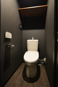 トイレはウォシュレット付き。 トイレ内も珍しいですがフローリングになっています。ちょっと影になってしまい見えないですが・・・棚を支えているアイアン調の金具も洒落ています。