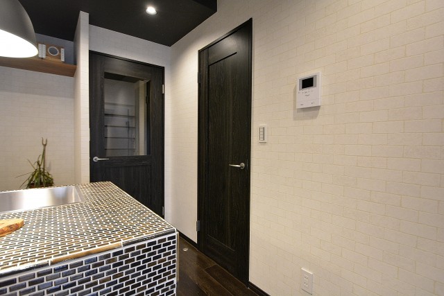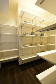 キッチンと反対側は冷蔵庫置場、収納スペース、パントリーの扉が並んでいます。