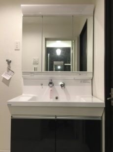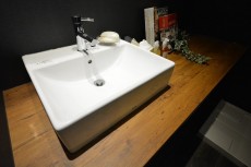 鏡の裏が収納スペースになっているので、小物類は見えないがところへ、おしゃれなソープボトル類などは木のカウンターの上へ置いてみてはいかがでしょう?