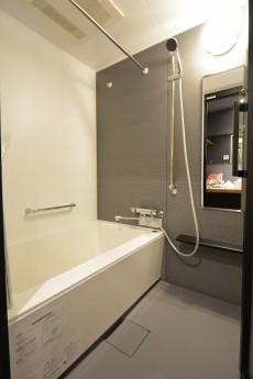 黒いパネルでスタイリッシュな浴室。お部屋とはだいぶ雰囲気が違いますね。こちらの浴室には色々仕掛けがあるようですので、順番に紹介していきます。