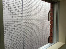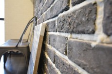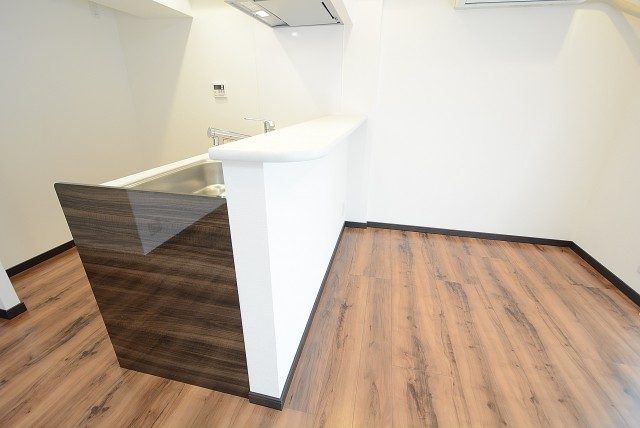 キッチンスペース。こちらの壁面もレンガ調ですが、白なので明るいです♪