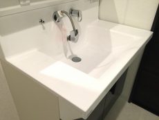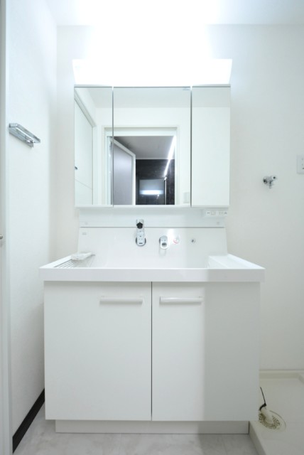 収納は洗面台下と三面鏡裏のキャビネット。キャビネットは細かい物が多くなりがちな洗面周りにはピッタリの収納です。