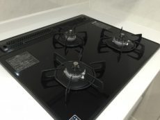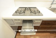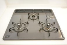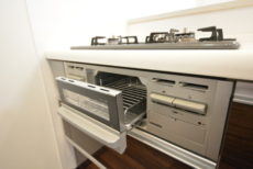 コンロは3口。片面焼きグリルも付いていて調理器具も充実しています。ガスの直火は何を焼いても美味しくなりますよね。海外ではあまり見かけないらしく欲しがる方も多いとか。