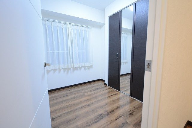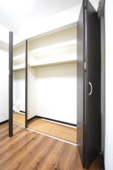 窓の外は隣の洋室と同じですね。窓のサイズが少し大きいので安全の為の柵も付いています。クローゼットはやはりフルオープンになるタイプ。姿見はお出かけ前の身だしなみチェックに重宝しそうです。