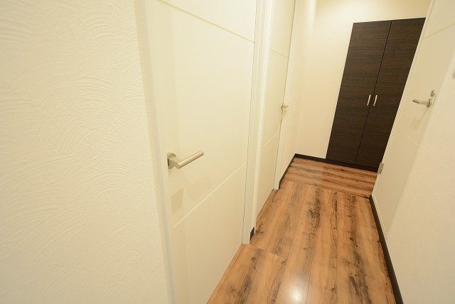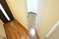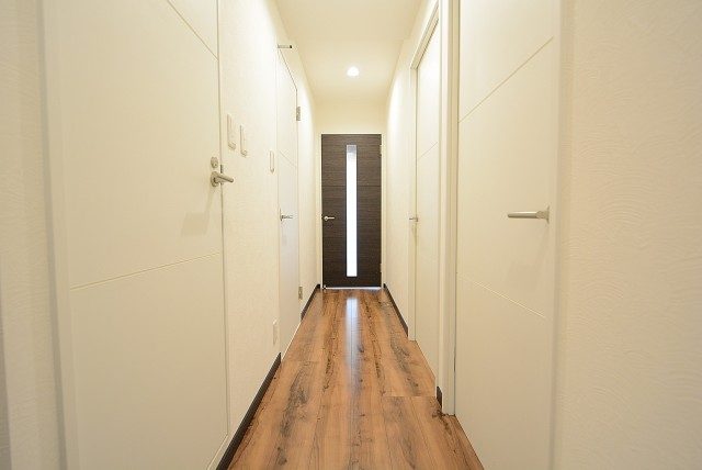 廊下の左側の扉はトイレ、正面のガラスが入った扉はLDKです。