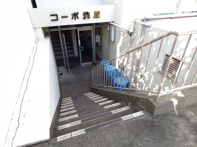 エントランスは階段を降りた先。1階分くらい下がったところにあります。