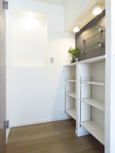 洗面室内には棚の高さが変えられる収納スペースも設けられています。