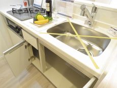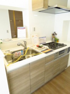 キッチンはフローリングに馴染む木目柄。水栓は浄水機能付き、コンロは3口とスペックも◎。
