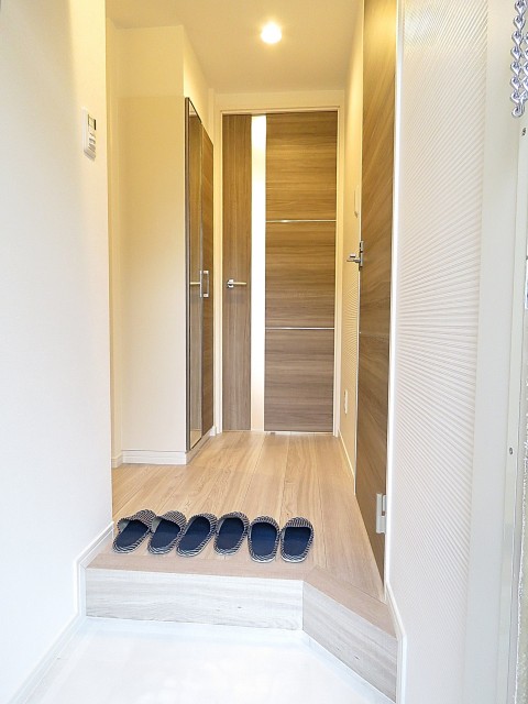 白基調の明るい玄関ホール。人感センサーがついており、人の気配に合わせて自動で照明が消灯します。消し忘れもなく経済的です。