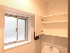 トイレットペーパーのストックや掃除用具を入れておくのに便利な吊戸棚も設置済み。窓があるのも◎。