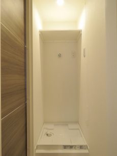 洗面室内には洗濯機置場、洗面化粧台、バスルームがまとまっています。