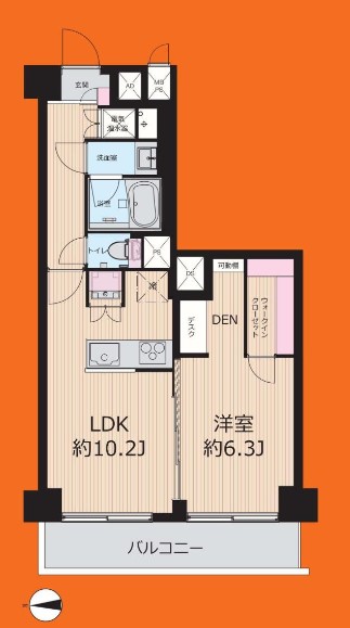 今回ご紹介するお部屋は1階、間取りは1LDK+DEN、専有面積は45.78㎡。お一人からお二人で住まわれるのにちょうどいい広さのお部屋です。では、早速行ってみましょう!