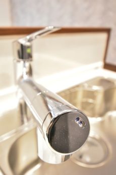 システムキッチンのワークトップはしっとりとした質感が魅力の人造大理石。