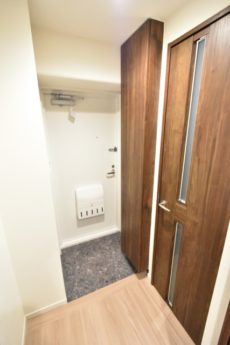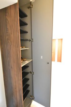 シューズボックスはトールタイプ。収納力抜群で、コンパクトな玄関に靴が溢れる心配もありません。隣のドアは・・・電気給湯器です。これ、いつもビックリしちゃうんですよね(笑)