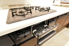 ワークトップが人造大理石のシステムキッチン 物の出し入れがしやすそうな収納