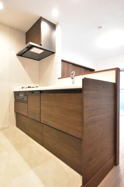 調理台は、お部屋の雰囲気に合わせたダークブラウンのパネル使用。
