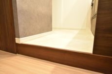淡いベージュの木目柄パネルが使われたバスルーム。