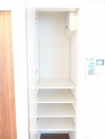 廊下にも棚のついた物入れがつくられています。日用生活品を入れておくのに