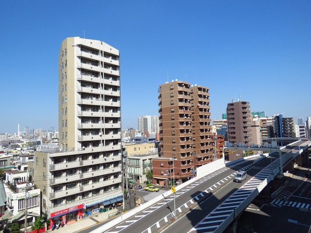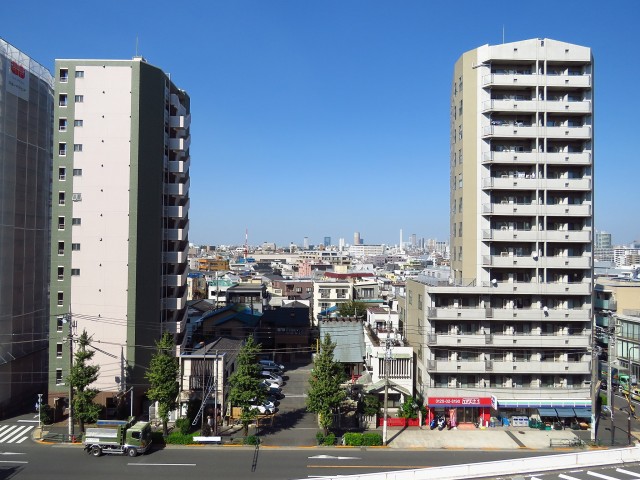 眺望。中原街道沿いに高いマンションが点々と建っていますが、その間からは抜けた眺めがご覧いただけます。空も広く見えてなかなか爽快な眺めです。