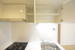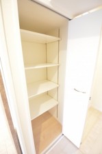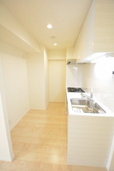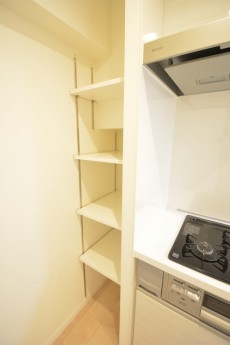 独立タイプの広々としたキッチンスペースは冷蔵庫以外にも食器棚なども置けそうです。 奥には可動棚の収納スペースもあります。
