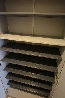 玄関の右側にはシューズボックスがあります。シューズボックスはフロートタイプで床から少し浮いているので1番下の段も取り出しやすくなっていますね♡可動式の棚なので、靴のサイズに合わせてご自由にアレンジしてください。扉には大きな姿見があるのでお出かけ前のチェックもバッチリです♪
