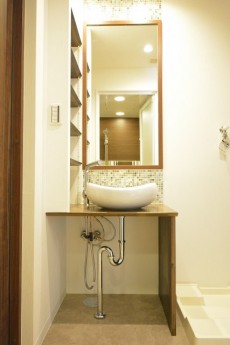 洗面化粧台はまんまるの洗面ボウルとモザイクタイルが印象的。鏡の横の棚と洗面カウンターも木の質感たっぷりです。