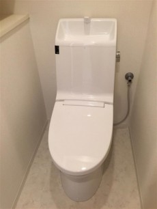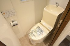 トイレはウォシュレット付き。上にペーパーのストックや掃除用具を入れておくのに便利な吊戸棚がついています。(窓もあります。)