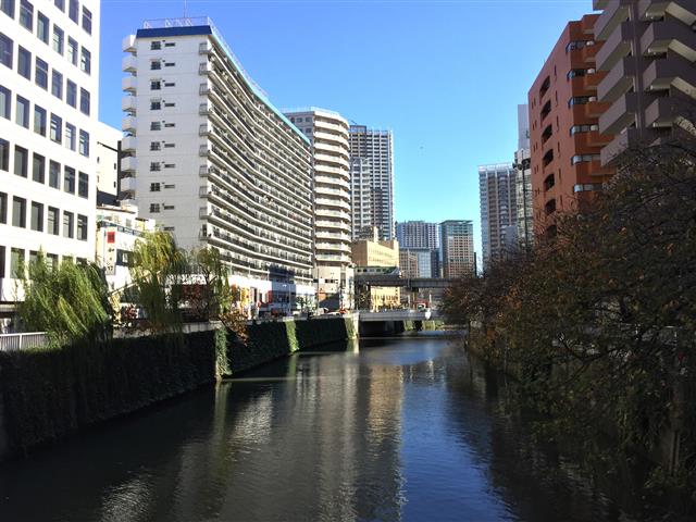 駅の南側には、目黒川が流れています。目黒川は桜の名所なので、春になると川が桜の花びらでピンク色に染まります。