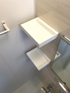 シャンプーなどのボトルもキレイに並べて置ける棚があり、清潔感のある空間を保てますね◎モザイクパターンの床は、すばやく乾燥、楽々お手入れ♪♪