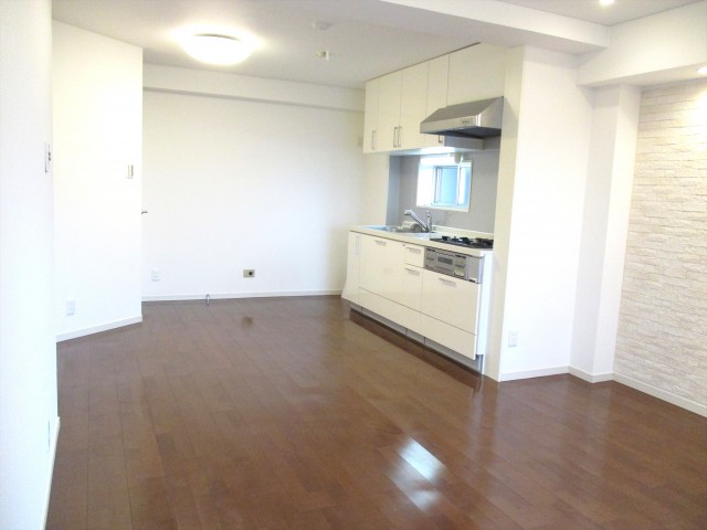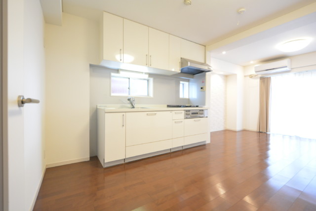 こちらは約11.8帖のリビング・ダイニング・キッチン。キッチンが壁付けで四角いオープンなスペースが使えるので、レイアウトの自由度も高いお部屋です。二面採光で風通しも良さそうですよ。一つ窓に比べて10倍近く換気能力が上がるとか!