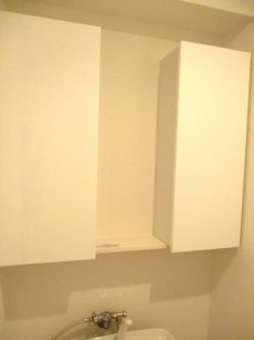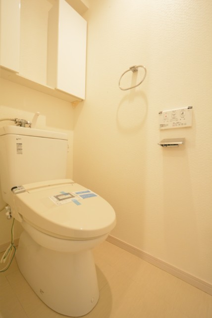 後ろには大きな吊戸棚が設置されています。真ん中部分はカウンターになっていて何か飾る事も出来ますよ。今はインテリアになる消臭剤などもあるようですから、そんなのもいいかもしれませんね。もちろん温水洗浄便座付き。LIXIL製のシャワートイレです。