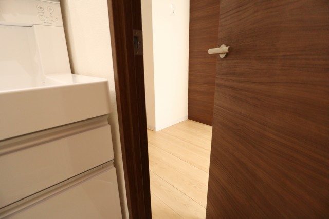キッチンと反対の壁面には洗面室の扉、そこから壁をはさんで洗濯機置場が設置されています。アンティーク調の扉がオシャレです。