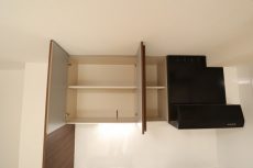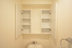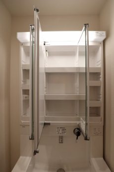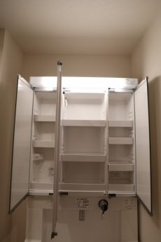 見た目もオシャレな洗面化粧台は鏡の裏が収納になっており、ハブラシや洗顔フォームなど生活感がにじみがちな物も見えないところへ仕舞って置けるようになっています。ちなみに中も鏡です。