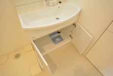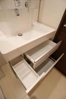 洗面化粧台はLIXIL製。白で清潔感たっぷり&収納が豊富です。