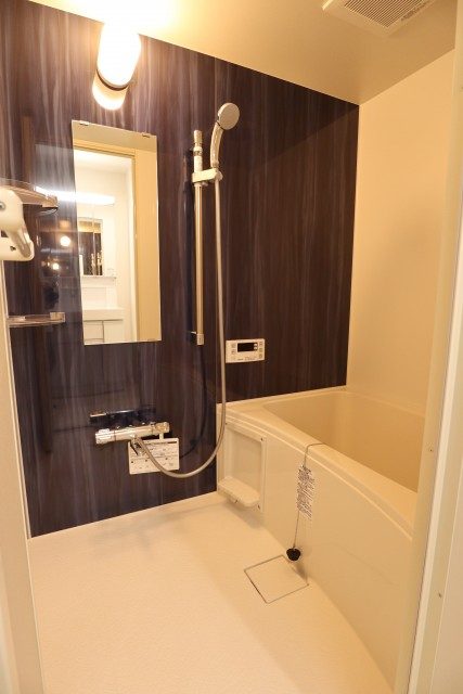 一面だけブラウンの木目パネルを使用していて、落ち着いた雰囲気の浴室です。いいリラックスタイムが過ごせそうですね♬