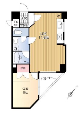広さ3.12㎡、三角形のコンパクトなバルコニーになります。室外機などを置くとほぼいっぱいですね。向きは南東向きで、午前中を中心に陽当りは良さそうです。