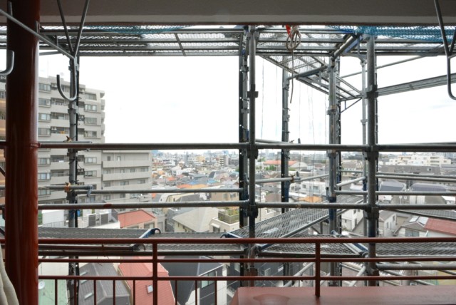 バルコニーからの眺望です。只今大規模修繕中で足場が邪魔ですが、無くなれば開放的で気持ちいい眺めになりそうです。工事中は煩わしいですが、定期的な修繕は大事ですからね(^^)