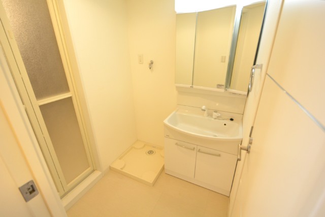 洗面台は三面鏡付き。上部にライトも付いているので洗面台を使う時に影になったりもしませんよ。水周りはやっぱり清潔感のある白がいいですよね。