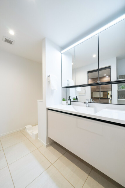洗面室には洗面化粧台の他に洗濯機スペースと浴室があって脱衣所も兼ねています。ゆったりサイズの洗面化粧台は身だしなみのチェックに便利な三面鏡付き。上部に照明が付いているので影になることもありませんよ。洗濯機スペースにはカウンターが付いているのでランドリー用品はこちらへどうぞ。