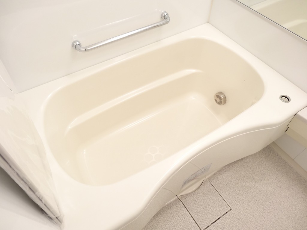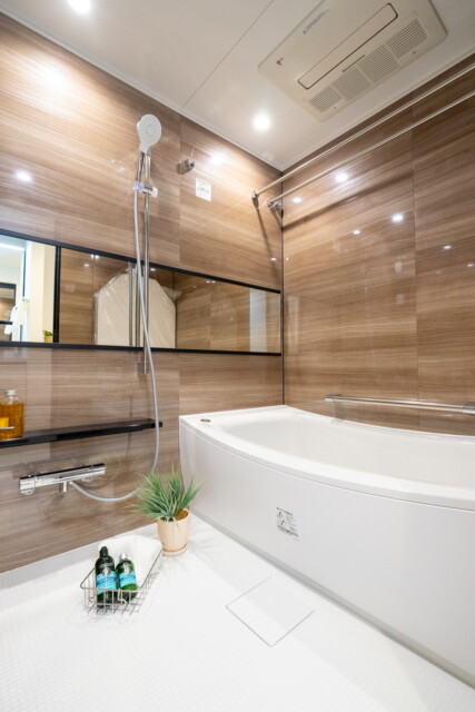浴室は鏡面仕上げの木目パネルを使用。落ち着いた雰囲気でリラックスしたバスタイムを過ごせそうですね。新規交換のTOTO製ユニットバスには追い焚き機能が付いていてお風呂の準備もワンタッチ!そのまま保温もしてくれるのでいつでも温かいお風呂に入れますよ。雨が続く季節に嬉しい浴室乾燥機付き。