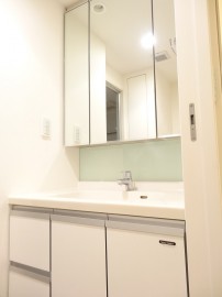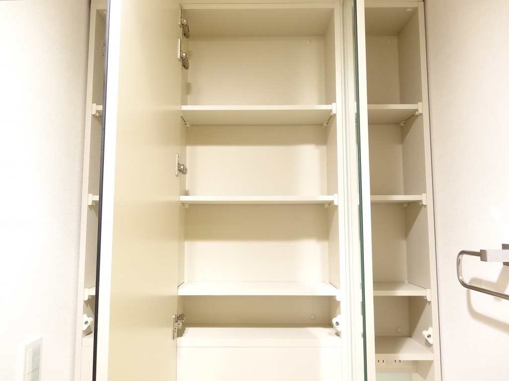 3面鏡の裏に小物が収納できるようになっている洗面化粧台。