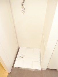 洗面室は入口入って右手に洗面化粧台、正面にバスルーム、左手に洗濯機置場