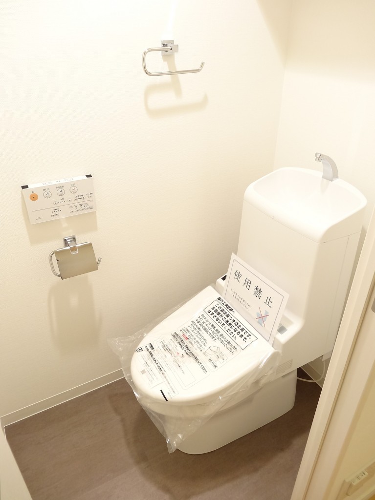 トイレは手洗いカウンター付き!手洗いが付いているとワンランク上って感じがしませんか?写真だけ見たら洗面台だと思ってしまいますよね(笑)すっきりとしたタンクレスの便座は洗浄機能一体型。収納も豊富でトイレットペーパーや掃除道具をしまっておくのに便利ですよ。