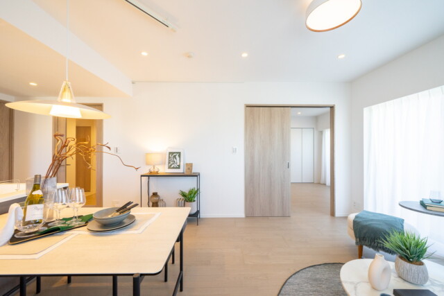 明るく風通しのよい二面採光のお部屋です。中間調の木目や白といった癖のない内装なので、合わせるインテリアによって様々な雰囲気にしていくことが出来そうですね。ちなみに家具はディスプレイ用で付いてはきませんので、サイズや色、素材感などいろいろ参考にさせてもらいましょう!