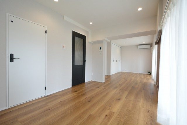 縦に長く、横面のバルコニーからの光で明るいお部屋ですね。中間調のフローリングに白のクロスが基調となっていて、ドアとキッチンの黒がアクセントになっています。